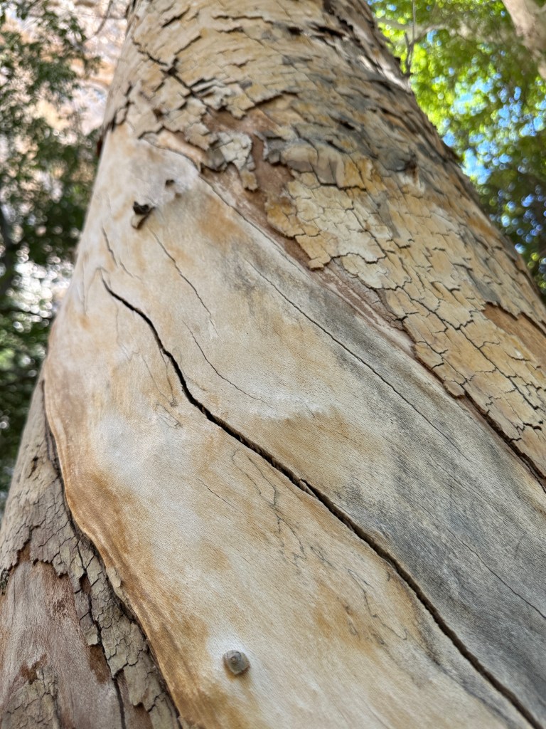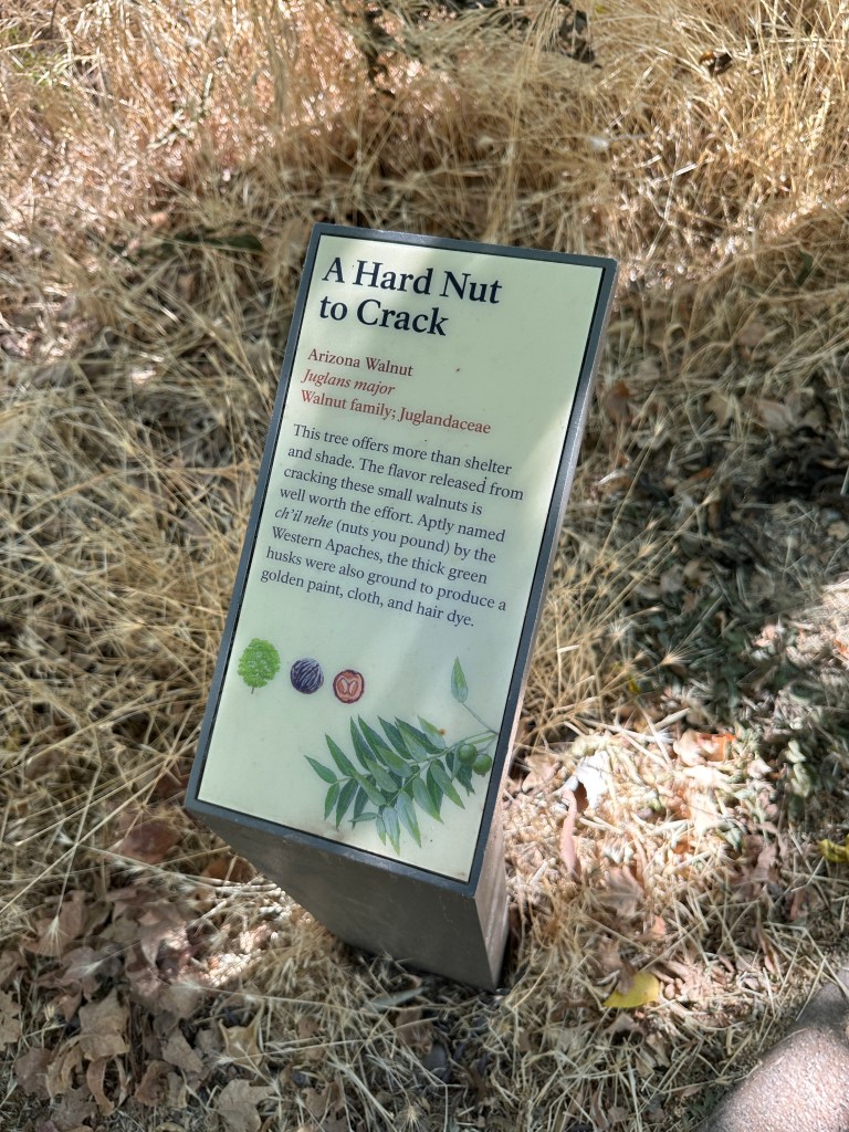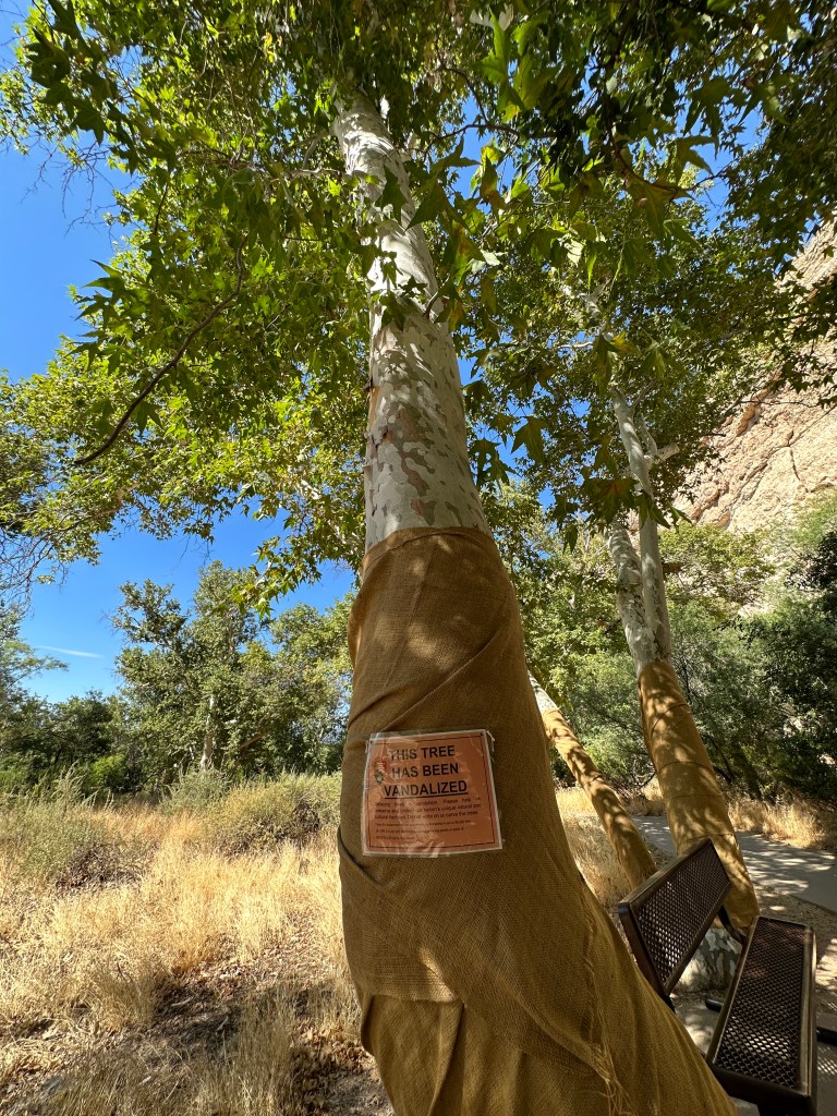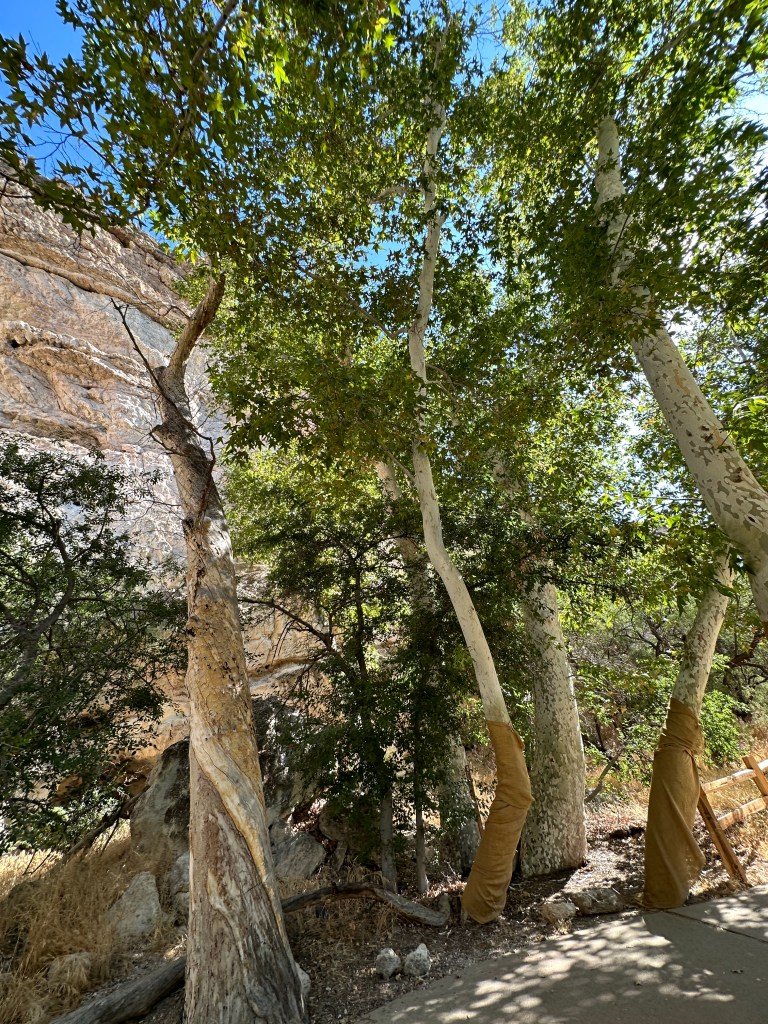 Visiting areas such as these allow you to begin to think outside yourself. You begin to better see how previous inhabitants of Earth from an earlier time lived in communion with the Earth, embracing it, and using natural resources within reason. Along this trail are signs that identify plants used by these people as food, resources, and medicine. Montezuma’s Castle provides perspective about our place in this vast world. There are unfortunately some indications of the impact of ignorant individuals who feel that nature is at their disposal. See the photos of sycamore trees–so vandalized by visitors, that they needed to be wrapped in burlap to protect them and labelled with signs. How sad is that? Who goes to a sacred site and thinks, ” I’m going to carve in this tree?” We also observed an older woman who felt free to climb on the site in off limits locations. Gotta get that photo…If you cannot respect sites such as these, please stay home.