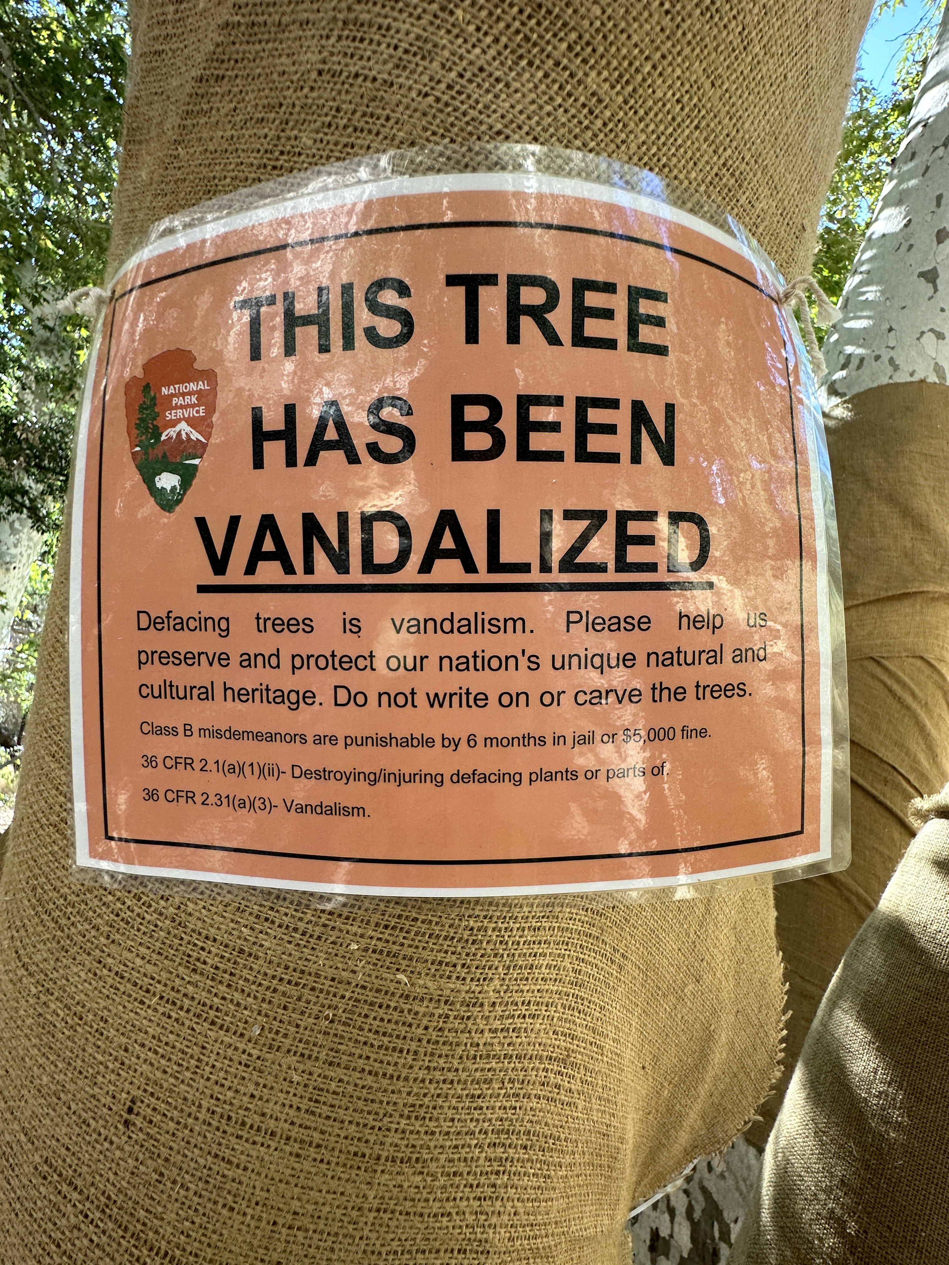 While visiting a national park, we came upon this wrapped around a tree. What is going on in this world that this tree would need to be protected from mutilation? Not only is this tree in a national park, but it is an important part of the cultural heritage of the area. What has this tree “seen?” What has it witnessed? More importantly, what thoughts enter a human’s mind that make them think, ” I want to carve into this tree and leave a scar?”