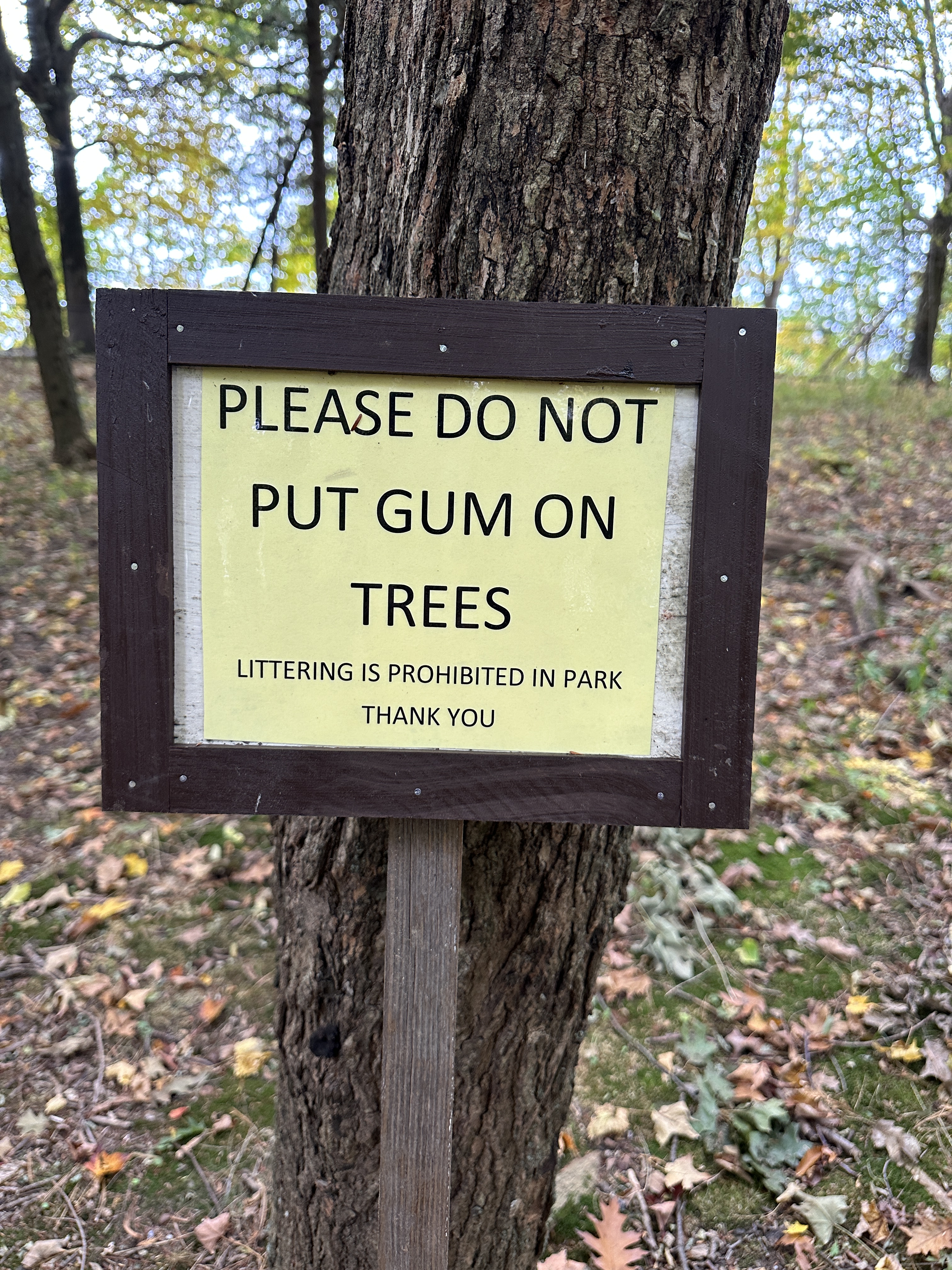 Have we really gotten to the point that we need to be reminded NOT TO STICK GUM ON A TREE? This is extremely disconcerting in all aspects. Instead of being able to enjoy nature, we have to be subjected to signage on trees to remind us not to deface them. (insert sad face here)