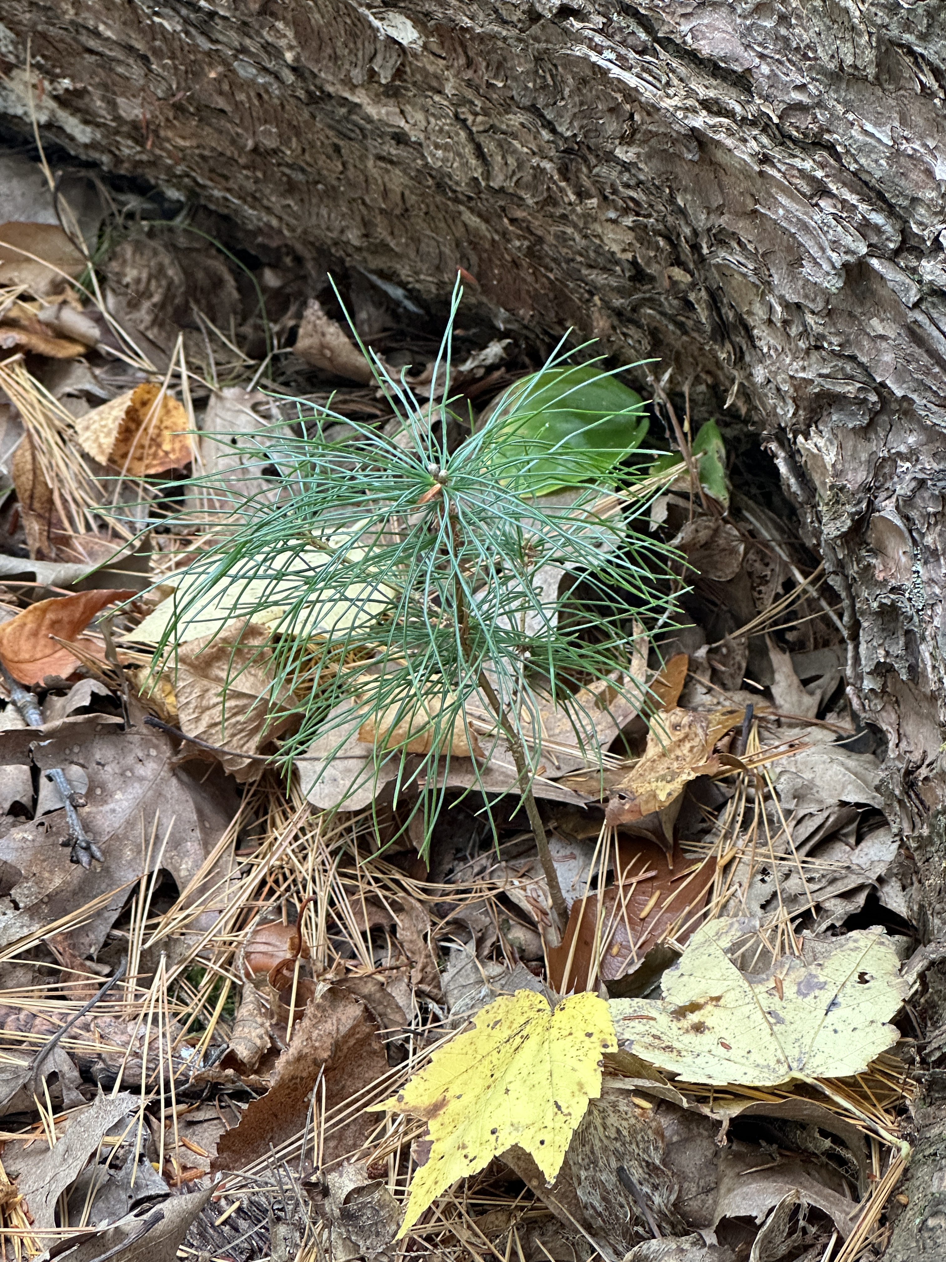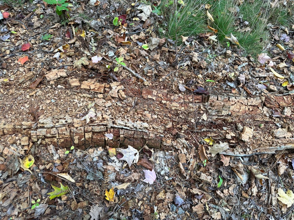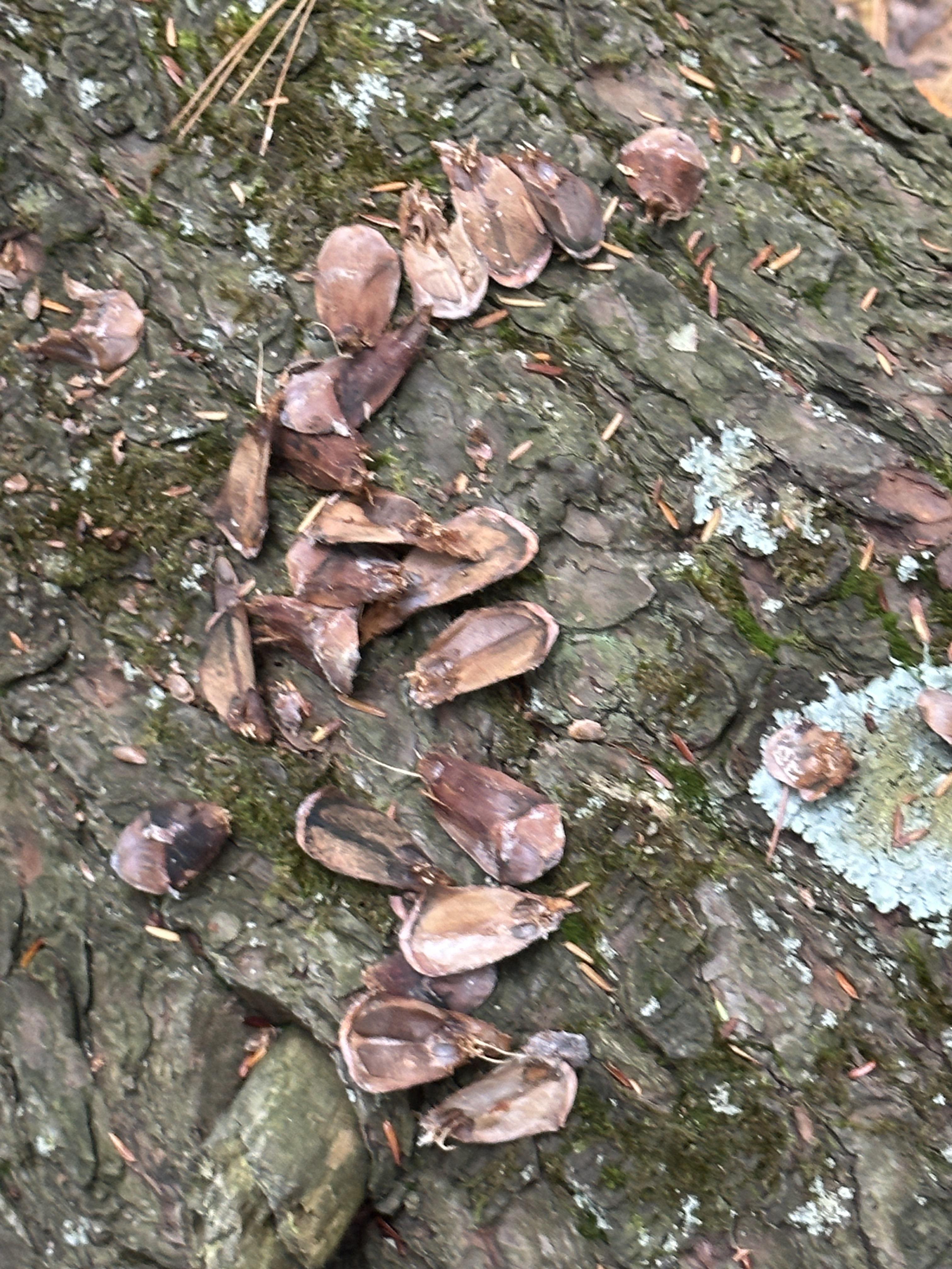 In the photos below, spot a miraculous tiny pine tree that survived to thrive and emerge amongst the fallen pine needles and leaves–sheltered next to a giant exposed root. The second picture provides evidence of the organism in the third photo. The remains of a shredded pine cone that a squirrel left behind in search of seeds. Finally, the bottom photo–that of a long, fallen tree in decay. Look close to see the layers of wood now broken apart and returning to the soil. In fact, all these little particles, decompose, return their stored nutrients to the earth, and combine together to create more soil for us humans who often just throw it out. (take a walk in your neighborhood and look for all the potted mums, ferns and other plants that are thrown to the curb with soil clinging to their roots)