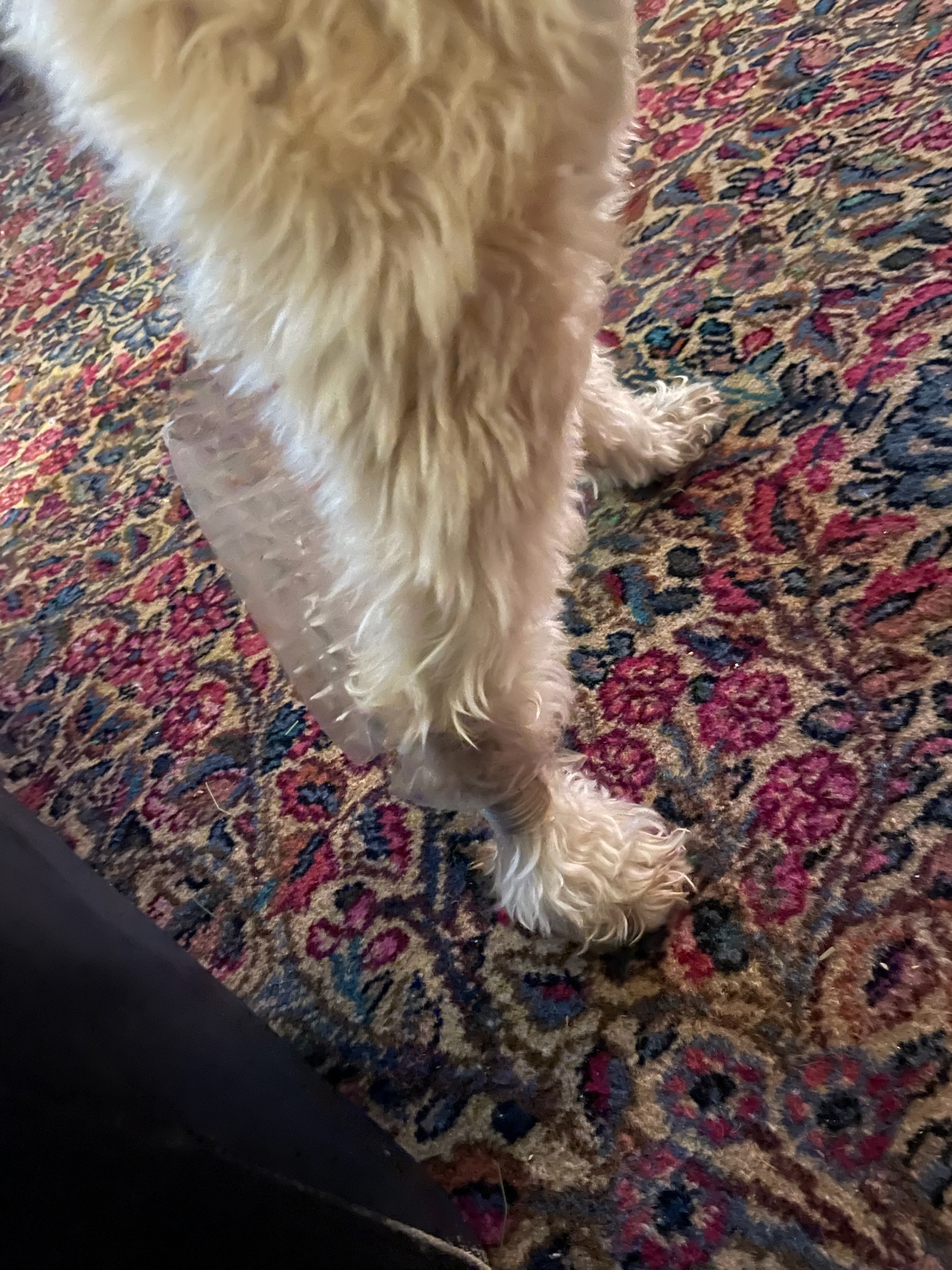 I am happy to report, that after a bit of time, Honey was freed from her plastic leg “guard.” Honey suffered a couple of says with a bit of a limp and a sore leg, but is now recovered.