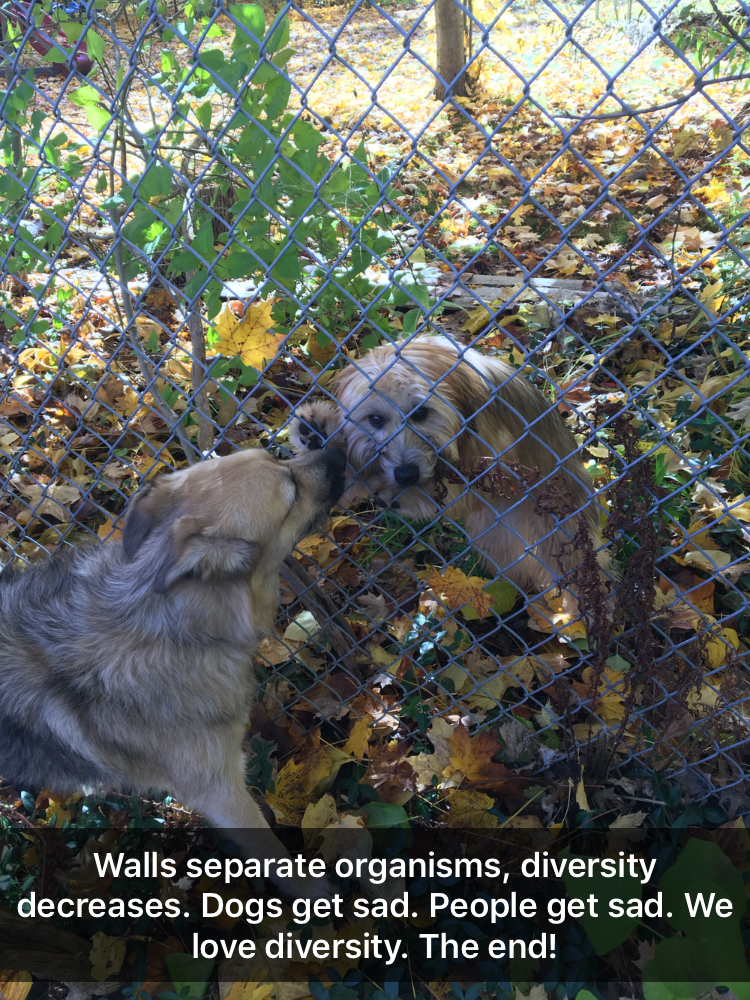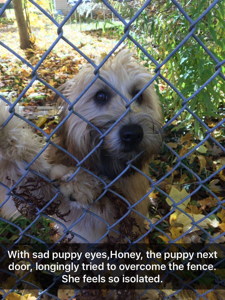 Next door to us is the cutest little dog–Honey! She has been the star of the show when Ranger does his science. She spends her days happily going in an out of the house in a fenced in yard to keep her safe. She is Ranger’s best dog friend. Our neighborhood is relatively litter free and everyone seems to take the time to recycle. But recently, Honey had an issue. Upset and barking she was found like this (see above picture to left) standing in her safe, secluded yard. How does this happen?